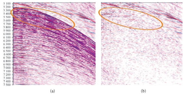 图3—44 (a)处理前的多次波和(b)处理后的原始反射波能量图