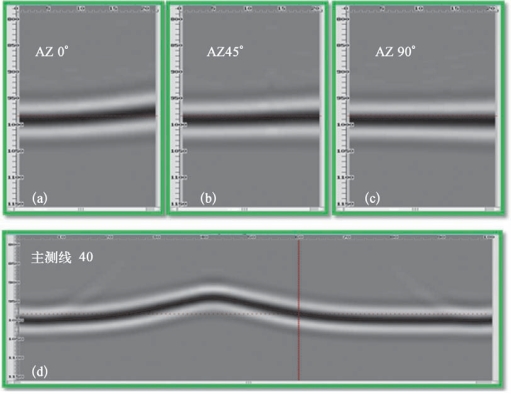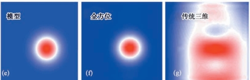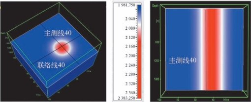 如图3—54所示为一个三维立体速度模型,在主测线40和联络线40处有一柱状速度异常体。在进行速度建模时,传统建模方法如图3—55(d)所示,会在一条线上整体拾取一个剩余时差值,作为反演的一个约束信息,整体的反演结果如图3—55(g)所示,而全方位的速度建模则把这条线分为很多不同的方位分别拾取剩余时差,如图3—55(a)(b)(c)所示,使得同一条测线在不同方位上均有剩余时差值,反演结果和模型十分吻合,如图3—55(e)所示。