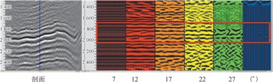 实例如图3—58所示:在一CMP点的共反射角道集可以看出,从反射角度为7°开始,在同一反射角度内道集并未拉平,也就是说相同反射角的不同方位存在HTI各向异性,这种各向异性通常是由裂缝的存在造成的。我们可以利用这种未拉平部分的剩余速度值,或者道集剩余量来进行裂缝预测,也就是通常所说的VVAZ技术。