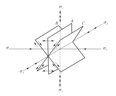 在三维空间中,应力状态可用三个相互正交的法向变量(即主应力)来表示,分量σ1、σ2、σ3分别代表最大主应力、中间主应力、最小主应力,如图3—56所示,裂缝以力学成因可分为三类。