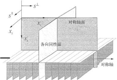 地下地层各向异性特征是真实存在的,只不过我们在实际地震资料处理解释的过程中简化了。随着油田勘探开发的深入及难度的加大,各向异性介质的储层属性慢慢地引起人们的重视。目前我们假设的各向异性介质有三种:垂直各向异性(VTI)、倾斜各向异性(TTI)和水平各向异性(HTI),实际上垂直排列的断裂是造成HTI的重要原因。寻找碳酸盐岩、页岩等油气储层的重要手段就是求取碳酸盐岩储层的裂缝,这种裂缝的各向异性特征表现为HTI。图3—57显示的是HTI的应力场情况,其中沿着断裂方向的水平轴平行于最大应力场方向(X2),而垂直断裂方向的水平轴是最小应力场方向(X1)。
