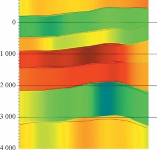 层析成像深度层速度修正的方法是利用CRP道集内同相轴是否拉平作为判别标准,道集同相轴上翘速度偏低,道集同相轴下拉速度偏高。拾取道集内同相轴的剩余曲率信息,利用层析成像技术修正深度层速度体(如图3—66所示)。速度模型修正的方法是一个多次迭代的过程,具体过程是:利用初始速度模型进行叠前深度偏移,对CRP道集内的同相轴进行自动剩余曲率拾取,利用剩余曲率反映的深度速度误差信息运用网格层析成像技术修正速度体,再进行下一轮的迭代,直到道集被拉平。与初始深度速度模型建立一样,速度修正过程中,井资料是一种质量控制手段。经过修正后的速度模型,垂向的变化与声波测井的变化趋势更加吻合。通过多次迭代修正及利用层析成像技术修正层速度模型,建立最终精确的深度—层速度模型,如图3—67所示。叠前深度偏移是以模型为出发点,目的是得到更清晰的地下模型,其成像过程实际上是一个不断迭代与优化的过程。经过模型优化后得到新的深度偏移结果,可帮助重新认识工区的地质情况,验证所采用的模型是否合理,通过进一步修改模型,使偏移成像结果更符合地下地质情况,确保取得较好的成像效果。