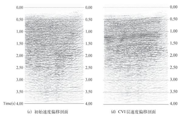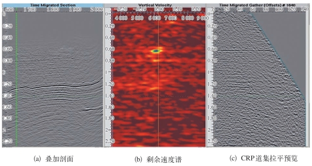 利用初始速度模型进行目标线的叠前时间偏移之后,产生了两个数据体:偏移叠加数据体和时间偏移的CRP道集数据。速度模型修改就是根据偏移后CRP道集,通过沿层和垂向的剩余速度分析,利用剩余分析量来更新速度体,直到延迟量集中在零值附近为止。