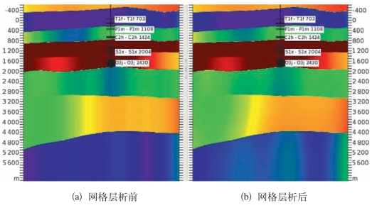 在速度模型更新前,对初始层速度模型进行严格的质量控制。前期搜集相应的测井资料,声波测井资料反映了垂向速度变化,深度层速度应该与声波测井速度变化趋势基本一致。可以利用这一控制手段对深度初始层速度进一步控制。