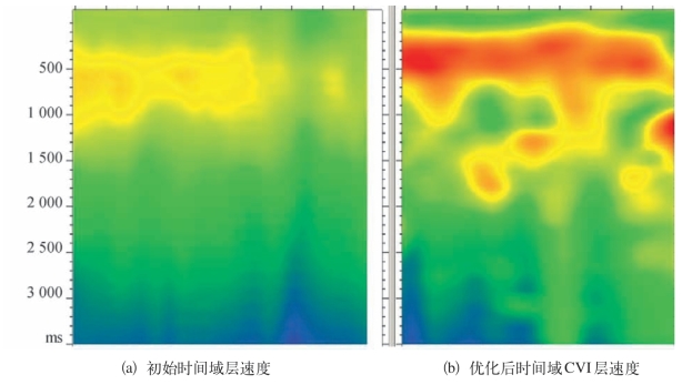 如图3—63所示,由于实际的地下介质为比较平坦的地层,我们由初始的叠加速度直接转化为RMS速度后,进行简单优化可得到均方根速度,再用过约束速度反演得到构造比较温和的CVI时间域层速度。