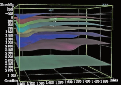 叠前深度偏移速度建模需要建立一个准确的构造层位模型对速度—深度地质模型的建立进行约束。为此,首先要在时间偏移数据上进行构造层位解释,时间域构造层位是否正确将直接影响层速度求取的精度和成像效果。由于叠加剖面上绕射波、断面波等纵横交错,很难拾取时间层位,故应在时间偏移剖面上尽量选取强能量的速度界面,进行构造层位解释。当然这些构造层位模型建立要基于井资料标定后开展解释,且是一个具有地质含义的层位构造模型,如图3—65所示。