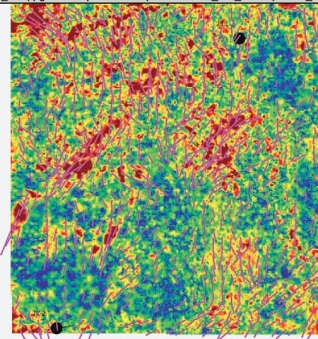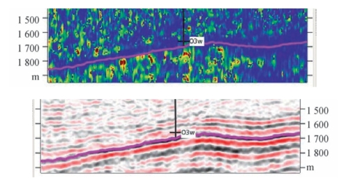 利用方位各向异性信息,将同相轴拉平后,我们进行AVAZ裂缝的预测结果如图3—74和图3—75所示。图3—74左边为通过AVAZ生成的目的层附近的裂缝分布情况,目的层是紫色拾取的层位部分;右边是成像剖面。