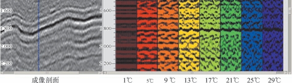 首先我们应用角道集进行HTI分析,如图3—73所示,在成像剖面某一CMP点的共反射角道集,不同颜色分别代表不同反射角,在同一反射角内我们可以看到同相轴的起伏变化,由此可见,地层存在明显的方位各向异性,即同一反射角内不同方位上的剩余时差差别很大。