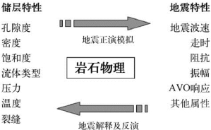 基于以矿物、岩性、流体类型、孔隙度、孔隙形状、渗透率、饱和度、韧性和裂隙等为参数的储层地质模型,通过岩石物理建模与分析,能够得到储层弹性参数,进行储层地球物理参数建模,从而可以进行地震波场正演模拟,得到以时间、振幅、波形、频率、入射角、方位角为参数的地震合成记录,岩石物理依然是桥梁和纽带。