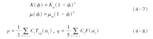 式中,K(φ)和μ(φ)分别是孔隙度为φ时的干岩石体积和剪切模量;Cl是砂岩和页岩占岩石基质的体积百分比;Tiijj(αl)和F(αl)参见Kuster-Toksöz(KT)模型部分。初始基质的模量计算采用下述方程: