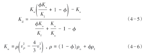 式中,Ko和Kf分别为岩石矿物颗粒的有效体积模量和孔隙流体的有效体积模量;ρ、ρo、ρf分别为岩石、固体矿物颗粒、孔隙流体的平均密度;φ为岩石孔隙度。