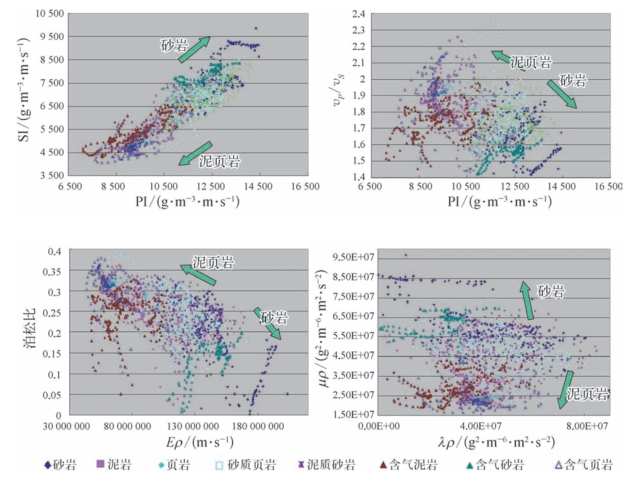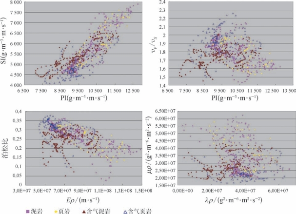 实际的岩石都是各种复杂矿物的混合体,因此选取纯的岩石并提取其参数进行分析有一定的难度,本研究通过录井资料,将数据点分为砂岩、泥岩、页岩、砂质页岩、泥质砂岩、含气泥岩、含气砂岩、含气页岩,进行不同的弹性参数交会分析。如图4—12所示,砂岩、泥岩、含泥砂岩和含砂泥岩等的主要弹性参数的规律表现为:PI,砂岩>含气砂岩>泥质砂岩(砂质泥岩)>含气泥岩(含气页岩);SI,砂岩>含气砂岩>泥质砂岩(砂质泥岩)>含气泥岩(含气页岩);P/