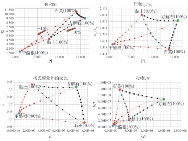 基于构建的岩石物理模型,通过设定不同的输入参数,可得到不同的矿物组成时的不同弹性参数的变化图,如图4—11所示,分别以石英、方解石、黏土、干酪根为端元点,含量每10%为变化。由图可见,纯的矿物的弹性特征表现为:PI,方解石>石英>黏土>干酪根;SI,石英>方解石>黏土>干酪根;P/