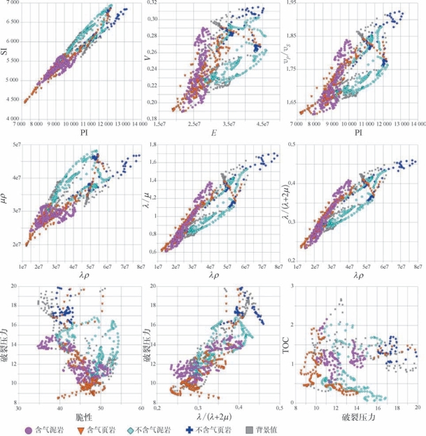 S,低杨氏模量,低泊松比,低λρ、μρ和λ/μ,低闭合应力系数以及低破裂压力;而通过TOC含量与脆性不能很好地将含气泥岩与不含气泥岩分开,这说明储层含气与否与有机质的高低没有直接的关系,同时,脆性层段、低闭合应力层段、低破裂压力层段都可以分为含气与不含气两种情况。含气页岩与不含气页岩的差别不如含气泥岩和不含气泥岩之间的差别明显。其中PI,SI,杨氏模量,λρ、μρ具有较好的区分度,而其他的弹性参数叠合区域较大。