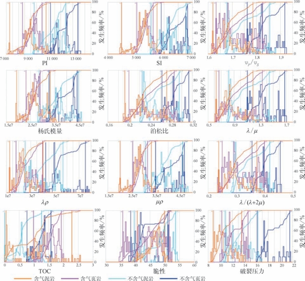 S),杨氏模量,泊松比,λρ,μρ,λ/μ]和储层参数[TOC含量,脆性,破裂压力,最小闭合应力系数λ/(λ+2μ)]进行直方图统计分析,如图4—9所示,对于泥岩(含气泥岩与非含气泥岩),弹性参数都可以将其区分开来,其中含气泥岩表现为低PI,低SI,低
