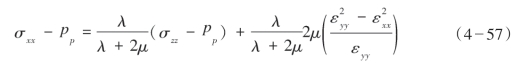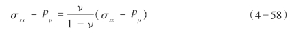在这个式子里,需要输入的参数有:① 闭合应力系数λ/(λ+2μ),也可以表达为υ/(1—υ),其中υ指泊松比,可以由速度(测井)、反演数据(地震)得到;② 有效上覆压力及地层孔隙压力,可以通过测井密度资料、当地的有效压力梯度及速度计算;③ 式中的最后一项,即与构造有关的项,可以通过横波各向异性参数近似求得。常用的计算最小闭合应力的方法是在上式的基础上略去构造项,如式4—58所示。