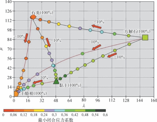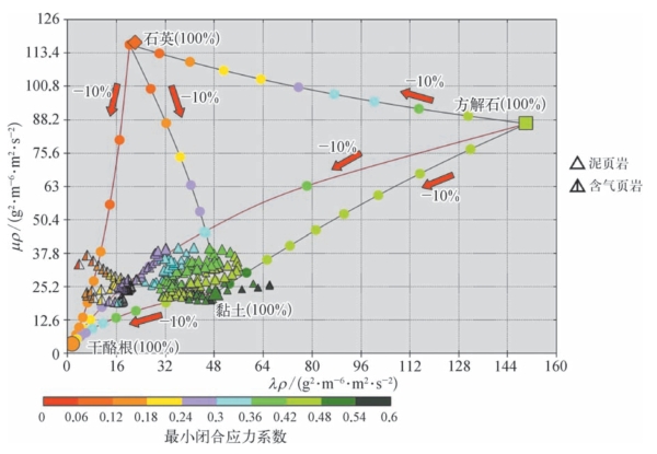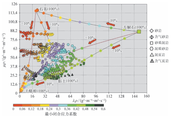 当不使用构造项(各向异性项)时所计算的应力与使用构造项时所得到的结果有一定的一致性,可以定性地反映地下最小水平闭合应力;当构造变化不显著且均质的假设下,最小闭合应力系数λ/(λ+2μ)可以定性地表示最小闭合应力的大小。因此,使用λρ—μρ—λ/(λ+2μ)表示最小闭合应力;建立不同矿物成分的λρ—μρ—λ/(λ+2μ)变化规律图版,如图4—23所示,石英、方解石、黏土、干酪根四个端元点及其组成物质规律性变化。端元点的弹性特征表现为:λ,方解石>黏土>石英>干酪根;μ,石英>方解石>黏土>干酪根;最小闭合应力系数,黏土>方解石>干酪根>石英。优质储层表现为最小闭合应力系数小,λ小,μ大,也就是在外力作用下容易发生开裂,同时,由此交会图也可以看出,需要选择高μ、低λ的趋势。