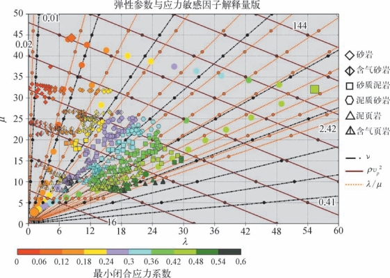 与脆性弹性解释量版类似,将弹性参数引入λ—μ—最小闭合应力系数解释量版中,如图4—26所示;这里分别引入泊松比(ν,黑色线表示),纵波模量(ρ2p,以棕色线表示),以及λ/μ,在最小与最大值曲线旁边用数字方式标明其所对应的值的大小,其中,ν的范围为0.01~0.46,每隔0.05画线;ρ2 p的范围为16~144 g·m—3·m·s—1,每隔16画线;λ/μ的范围为0.02~2.42,每隔0.2画线。使用这种方式,也可以较为容易地选取有利岩性/储层并建立标准,比如含气页岩特征为:ν小于0.16,纵波模量在16~32,λ/μ在0.02~0.82。将这种标准/规律应用到其他井中,或者地震叠前反演得到的弹性参数中,就可以比较简单地选择有利有效闭合应力区域。