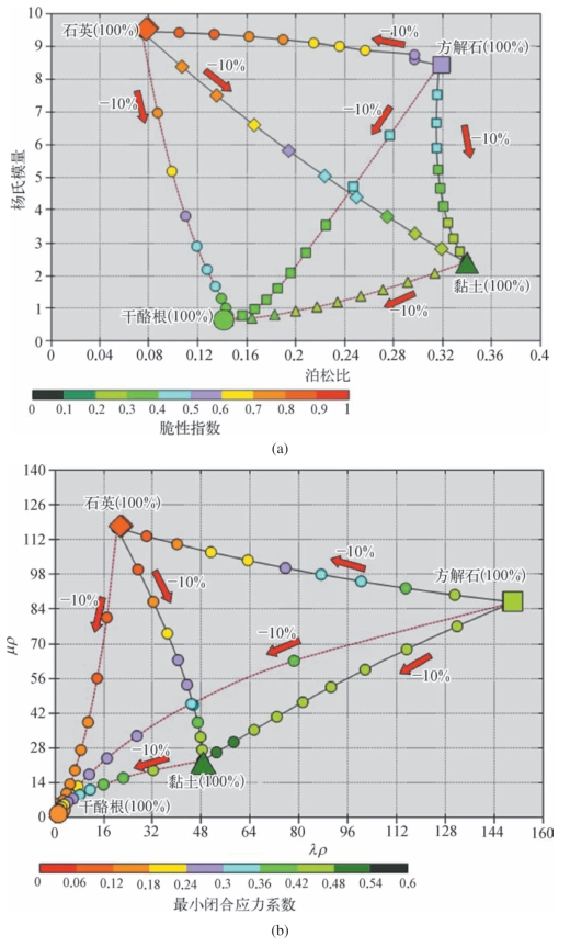 (a)杨氏模量—泊松比—脆性—矿物关系图;(b)λρ-μρ—最小闭合应力系数—矿物关系图