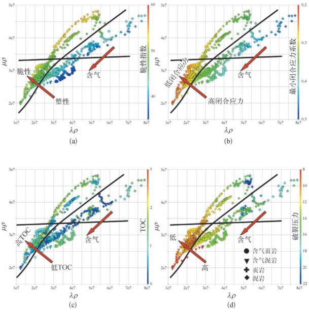 (a)λρ-μρ-脆性—矿物关系图;(b)λρ-μρ-最小闭合应力系数—矿物关系图(c)λρ-μρ-TOC-矿物关系图;(d)λρ-μρ-破裂压力—矿物关系图