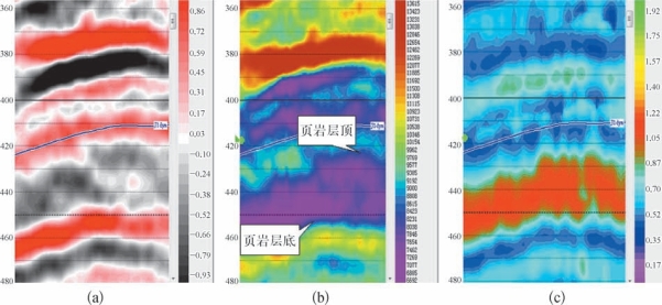 图5—18 (a)地震剖面;(b)波阻抗反演剖面;(c)TOC反演剖面