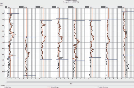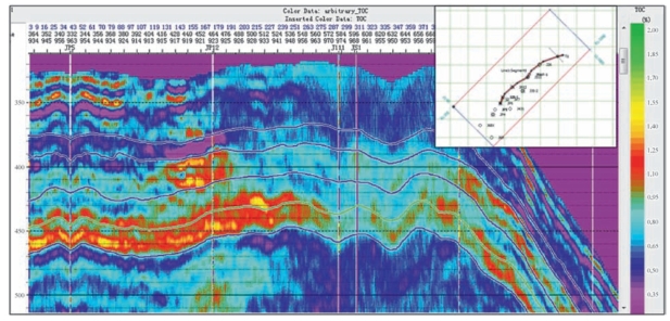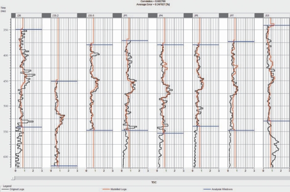 通过地震属性进行TOC的预测,需要建立地震属性和TOC的关系。通过岩石物理分析和测井资料分析,可以看出,纵波阻抗、密度、纵横波速度比等地震属性都与TOC有关系。通常使用神经网络方法将这些地震属性与TOC联系起来用于TOC的预测,其目的在于选用多个地震属性,借助于神经网络的局部模式识别功能和专家优化法,建立地震属性与TOC之间的函数关系,达到预测TOC含量的目的。