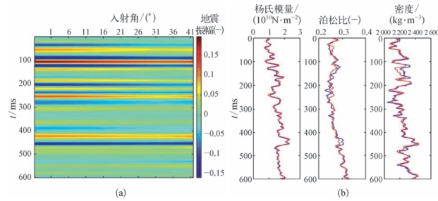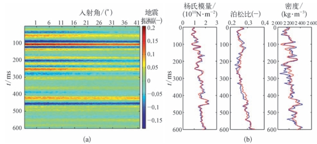 图5—30 (a)无噪声情况下角度域合成地震记录;(b)无噪声情况下反演的杨氏模量、泊松比和密度结果(红色曲线为反演结果,蓝色为实际模型)(宗 兆云等,2012)