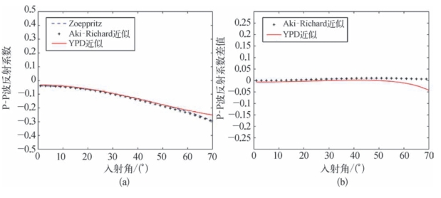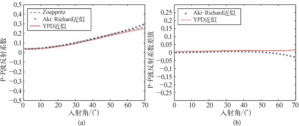利用Goodway等(1997)根据实测资料给出的含气砂岩模型(如图5—27所示),对YPD方程、精确Zoeppritz方程和Aki-Richard近似方程计算的反射系数的精度进行分析。入射介质波阻抗小于透射介质波阻抗的界面称为正波阻抗界面,反之称为负波阻抗界面。上述模型中,上覆页岩、下伏含油气砂岩的反射界面就是负波阻抗界面,而上覆砂岩、下伏页岩的反射界面为正波阻抗界面。以上述模型为基础,分别用精确的Zoeppritz方程、Aki-Richard近似方程、YPD近似方程计算得到不同界面处的反射系数及近似方程与精确方程的残差。图5—28和图5—29分别为正负波阻抗界面对比分析,图5—28(a)、图5—29(a)为分别用精确的Zoeppritz方程、Aki-Richard近似方程、YPD近似方程计算得到的反射系数随入射角的变化;图5—28(b)、图5—29(b)为Aki-Richard近似方程、YPD近似方程计算得到反射系数与精确方程计算得到的反射系数的差值随入射角的变化。由图可知,基于YPD近似方程得到的反射系数在入射角为40°左右时仍与精确Zoeppritz方程有较好的近似,能够适用于较大角度入射情况下反射系数的准确求解,能够满足叠前地震反演的要求。