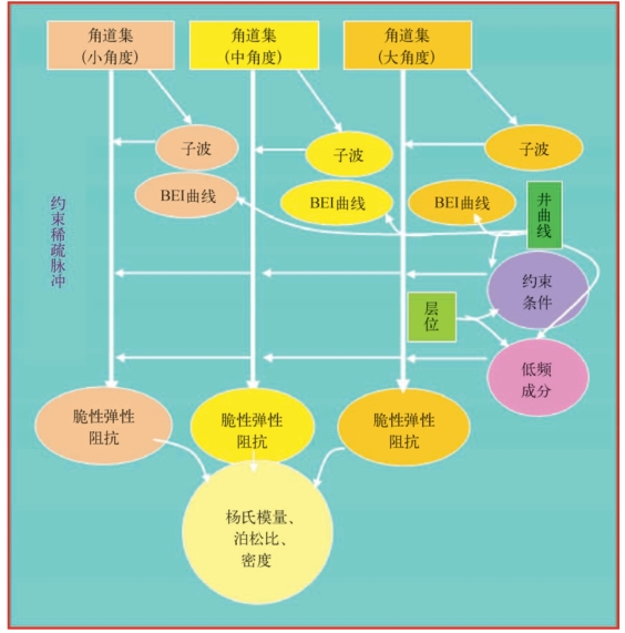 脆性弹性阻抗体的反演是井震标定、子波提取、建立低频模型多个步骤的综合,总结为以下几步:首先根据实际地震数据划分不同的角度范围,叠加得到不同角度数据体;根据划分的不同角度计算井中不同的伪测井曲线;接下来利用不同的地震角叠加数据体和相应角度的FEI井曲线分别提取不同角度子波,并进行层位标定;最后利用约束稀疏脉冲反演对不同角道集数据体进行反演。约束稀疏脉冲弹性阻抗反演处理流程如图5—32所示(分为三个角道集的情况)。