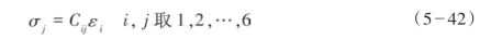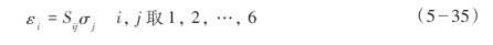 式中,νxy=εx/εy,νxz=εx/εz,νyz=εy/εz,yx=εy/εx,Ex=σx/εx,Ey=σy/εy和Ez=σz/εz。此外,应变εi可由矩阵式(5—41)计算。例如,水平应变x方向分量可写成: