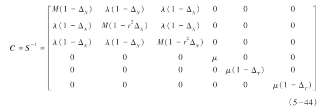 因此,通过对式(5—40)的转置,矩阵C可以由柔度矩阵S获取。根据Schoenberg和Sayers的理论,柔度矩阵的转置可以写为: