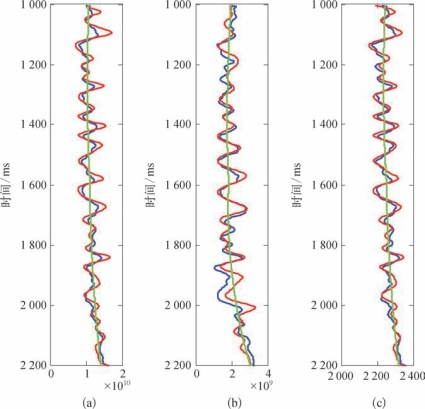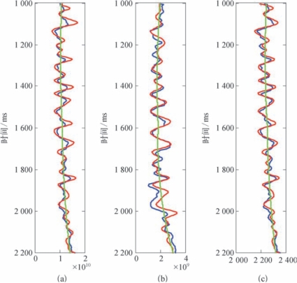 图5—39 无噪声情况下(a)纵波模量、(b)横波模量及(c)密度的反演(蓝色代表实际模型,绿色代表初始模型,红色代表反演结果)