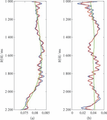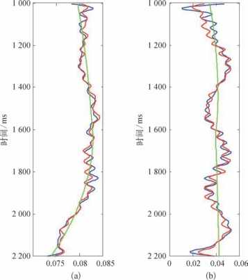 图5—42 加噪10%的情况下(a)法向弱度、(b)切向弱度的反演(蓝色代表实际模型,绿色代表初始模型,红色代表反演结果)