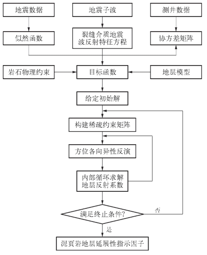 利用式(5—96),结合方位地震反演,可得到纵波模量、横波模量、法向弱度、切向弱度等参数。基本反演流程如图5—38所示。