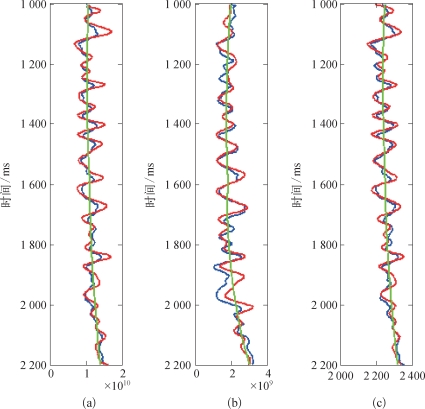 图5—43 加噪20%的情况下(a)纵波模量、(b)横波模量及(c)密度的反演(蓝色代表实际模型,绿色代表初始模型,红色代表反演结果)