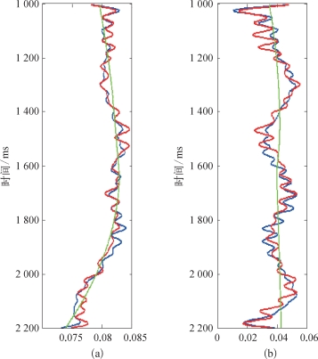 图5—44 加噪20%的情况下(a)法向弱度、(b)切向弱度的反演(蓝色代表实际模型,绿色代表初始模型,红色代表反演结果)