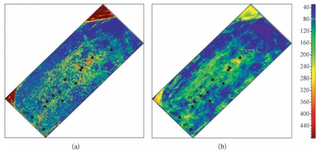 图5—50 (a)叠后相干切片与(b)AFE相干切片对比