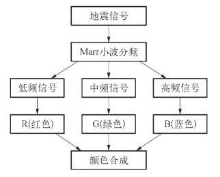 为了有效利用地震频率信息,合理显示每个样点的优势频率,我们分别用红、绿、蓝三种颜色,表示低、中、高分频信息,然后按分频能量比较结果做色彩叠加显示。三原色剖面作为一种频率信息,对构造解释,沉积相解释,岩性解释都有帮助。首先,用Marr小波模拟出不同频率(最好要满足倍频要求)的Ricker子波,然后对地震信号进行Marr小波分频处理,得到低、中、高三个不同频带的信号,接着将每个采样点的三个分频信号分别用红(R)、绿(G)、蓝(B)表示,最后红(R)、绿(G)、蓝(B)三原色合成为该采样点的颜色值(如图5—49所示),其基本原理可以表示成下式: