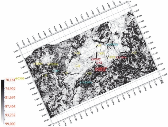 地震相干数据体计算是对相邻地震道数据计算其相干系数,其思想是对地震数据进行求异去同,突出那些不相干的数据,然后利用不相干地震数据的空间分布来解释断层、岩性异常体与岩层缝洞等地质现象。一般不连续变化所反映的是弱相干,反之为较大的相干值。对三维相干数据体进行切片解释或沿层拾取相干数据,能有效地反映出地下断层和裂缝的发育区。如图5—47所示是川西盆地某地须家河二段致密砂岩储层的纵波相干切片,纵波相干属性清楚地显示出主断裂、小裂缝及断层附近裂缝组的分布,这些特征用常规构造解释是很难识别的。井的产量信息显示,当井位于相干切片上的混乱区域时,生产率最高。