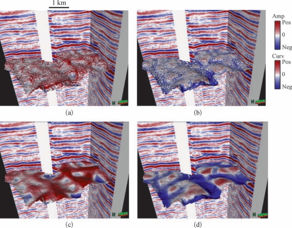 图5—46分别显示了正负长波长和短波长曲率水平切片,长波长曲率属性通常指示较大的弯曲和褶皱,而短波长曲率属性通常识别较小的断裂区。