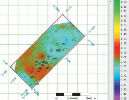 通过基于岩石物理模型及实测数据的分析,认为本研究区有机质含量较高的层段表现出高纵横波速度比,高泊松比,低μρ,低横波阻抗的特性(如图5—60所示)。通过神经网络方法建立起地震属性(纵波阻抗等)和TOC之间的关系。将这种关系应用到整个地震数据体,反演得到TOC数据体,对目的层提取平面图(如图5—61所示),进而对页岩储层的生烃能力进行评价。