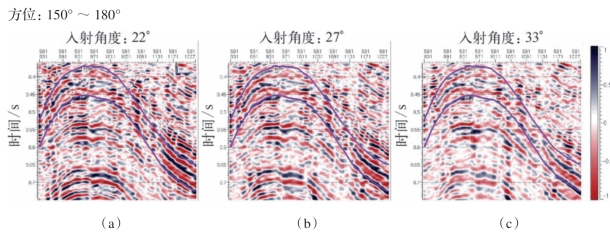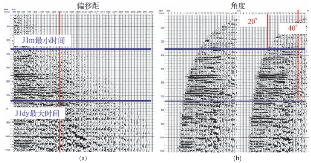 由于实际资料品质,使得工区实际应用存在以下三个难点:① 方位信息有限;② 目标层段埋深浅,缺乏小角度数据;③ 工区覆盖次数不均匀,数据信噪比低。图5—79中展示了偏移距域和角度域叠前道集,可以看到偏移距大于2 000 m,同相轴不明显,信噪比大幅降低,角度域小于20°的数据不足,大于40°的数据信噪比低。