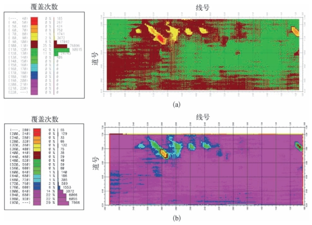 (a)原始50×25面元;(b)超道集处理后100×100面元