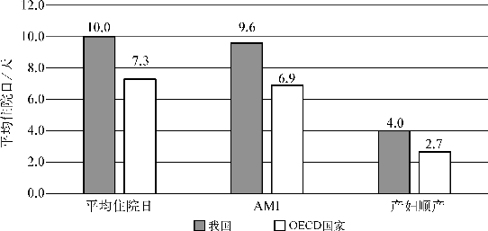 从国际上来看,我国居民的入院率和平均住院日均处于较高的水平。根据2014年中国卫生和计划生育统计年鉴,2008—2013年,我国居民(年鉴调查区域内)住院人次数年均增长率为15.3%,住院率从6.8%上升至9.0%。2013年,我国居民年住院率为14.1%。在同一时期内(2008—2013年),OECD国家的平均住院人次数仅增加了0.7%。从住院日情况来看,2013年,我国公立医院平均住院日为10.0天,其中,三级医院平均住院日为11.0天,而OECD国家2013年医院平均住院日仅为7.3天。从病种住院日的情况来,2013年,我国急性心肌梗死(acute myocardial infraction,AMI)患者的平均住院日为9.3天,顺产的平均住院日为4.0天;而OECD国家急性心肌梗死住院患者的平均住院日为6.9天,顺产产妇的平均住院日则为2.7天(见图1-2)[28,29]。虽然由于卫生系统、医疗技术、诊疗习惯以及经济与社会等方面存在差异,将我国与OECD国家的住院日直接进行比较缺乏合理性,但这一差距仍在某种程度上反映了我国的入院和住院日中存在着一定的效率损失。