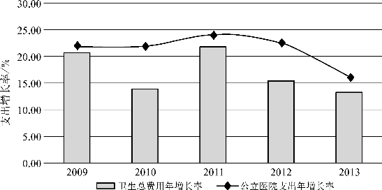 总量的增长并不能保障增长结构的合理。近年来,随着卫生投入的不断增加,基层卫生服务机构数量大幅增长,但由于历史、经济、社会等原因,我国提供卫生服务的主力军仍然是医院。在我国,医院承担着多样化的职能,尤其是三级医院,需要向多个地区提供高水平的免疫预防、治疗疾病、培养教育服务,并承担科学研究等任务[7]。其中,与人民群众生命健康最为息息相关的是医院提供的治疗服务。一般而言,医院提供的医疗服务的方式主要有门诊、急诊和住院3种,通常,住院服务更加昂贵、占用的卫生资源更多。根据我国卫生和计划生育统计年鉴,2013年,超过70%的医疗卫生支出发生在医院,72.90%的入院人次集中在医院,在医院总收入中,住院占65.37%。从2009—2013年,随着公立医院改革的推进,虽然公立医院数量从15483家减少到13396家,但在此期间,医院的费用增长始终高于卫生总费用的增长速度(见图1-1),公立医院卫生费用的年平均增长率为20.99%,高于卫生总费用平均增长速率18.48%。其中,医院入院人次数年平均增长率为13.34%,人均住院医药费年增长率高达12.60%;我国医院床位数从312.08万张增长到618.19万张,年平均增长率为18.64%[4,8-12]。可见,医院住院服务效率的提高,对合理配置卫生资源具有重要意义。