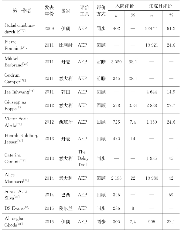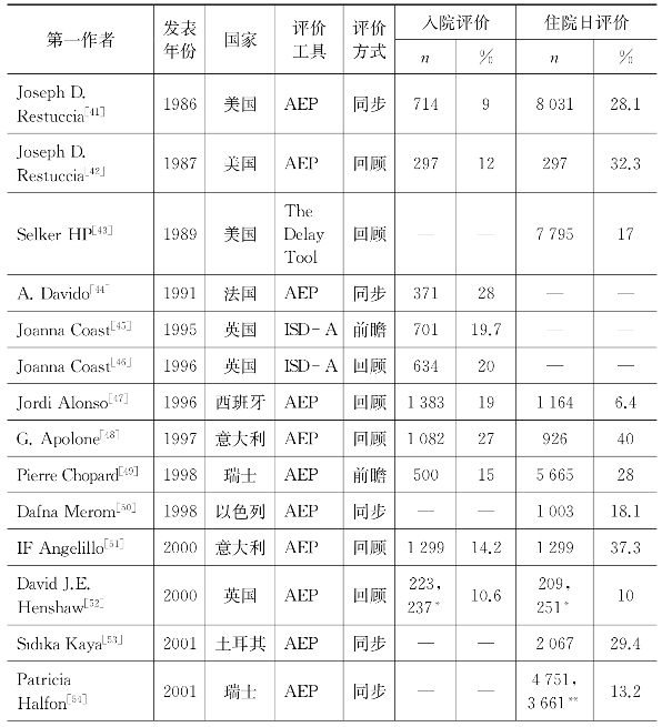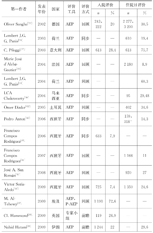本综述入选的国外入院/住院日适宜性评价的实证文献基本情况如表2-1所示。所选文献的发表年分布于1986—2015年,2000年前共10篇,2000—2010年共20篇,近五年来的入选文献量为12篇。从地区的数量分布上来看,由于对成本效率以及质量的关注,经济较发达地区对适宜性评价的数量也更多。在42篇入选文献中,欧洲地区的文献数量为29篇,占总文献数的三分之二以上;亚洲地区仅有8篇,分别来自以色列、土耳其、马来西亚、伊朗和韩国;美洲国家有美国和巴西共计4篇入选文献;非洲国家仅有埃及1篇。绝大多数研究采用的是适宜性评价方案(AEP)作为适宜性评价工具(37篇),使用其他指标型评价工具的共4篇,仅有1篇文献使用的评价方法为专家主观评价法。从评价方式来看,一半以上的研究(23篇)为回顾性研究(retrospective review),回顾性研究评价的一般是已经出院的患者的入院和住院日情况,通过相关历史材料(主要是出院病案),对样本入院/住院日的适宜性进行评价;14个研究采用的是同步性研究(concurrent study),即选定某日期后,对当天的入院/住院日进行调查,一般要求在搜集相关资料后的当天进行评价;所选文献中共有5篇是前瞻性研究(prospective study),即在患者入院后数小时内(在诊疗开始前)通过相关医疗服务人员提供的信息对该入院/住院日进行评价,该方法一般用于第三方付费前的审核,较少用于研究。在以上3种评价方式的基础上,均可以与相关医疗服务人员进行沟通和交流以获得更多信息。