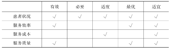 在国内外相关研究中有许多与适宜性相关的概念,如有效性、必要性、适当性及最优等,本综述根据这些概念对患者状况、成本效率和质量等内容的覆盖情况,及与卫生系统改革目标的一致性情况,将这些概念与适宜性概念进行了对比(见表2-3)。其中,有效性是与适宜性概念较为接近的一个,也是为较多学者认可的一种叫法。如王霞等(2001)认为,没有任何诊治项目的住院日就是无效住院日[87];陶婧婧等(2013)则对无效入院和住院日分别进行了界定,认为无效入院是在较低级别医疗机构即可满足其需求的入院,而无效住院日则指的是质量和效率较低的住院日[90]。从字面上来看,无效性这一概念比较容易产生误解,因为无论是从医疗角度还是社会经济角度来说,入院和住院日对患者都是有效的,这一效果可能是正向的,也可能是负向的。如某一住院日虽然没有产生任何服务项目,但是患者仍在等待某项服务项目的发生或者结束,且付费方也仍需负担当天所发生的成本(包括机会成本和发生的实际费用,以及可能发生的质量安全事故造成的成本),因而并不能认为它没有产生任何效果。另一个与适宜性较为接近的概念是必要性。必要性往往包含着“最低要求”“必须进行”的意思在内,其界定往往是从必要的反面来进行的,即对不必要性进行排除。如孙强等(2000)认为不必要性应该由专家认为的对健康的作用来决定[100],而王玖等(2002)则认为不必要性就是没有益处[101]。适度医疗常作为过度医疗的对立面出现在文献中,如杨同卫(2002)认为过度医疗是超出了患者和社会的实际需求的医疗[102],张忠鲁(2003)针对过度医疗,提出从需求角度出发,认为适度医疗是符合诊疗需求的医疗[103]。最优医疗则完全从患者的角度出发,指的是在不考虑资源限制的情况下,对患者益处最大的医疗,关注的是医疗安全和质量[104]。少量文献对适宜医疗进行了定义,如John N.Lavis和Geoffrey M.Anderson(1996)认为适宜医疗包括服务内容的适宜性和服务提供环境的适宜性两个方面,即医疗服务的有效和成本效果两个维度[2];Naylor C.D(1998)认为适宜性必须包含可承受性(affordability)、可及性(accessibility)和质量(quality)3个内容,但具体什么是适宜医疗,他认为这需要将所有因素考虑在内[3];Panis等(2004)则认为适宜医疗需要既有疗效又有效率[59]。这些概念既有相似之处又互相区别,在某些文献中也出现了交叉使用的情况。