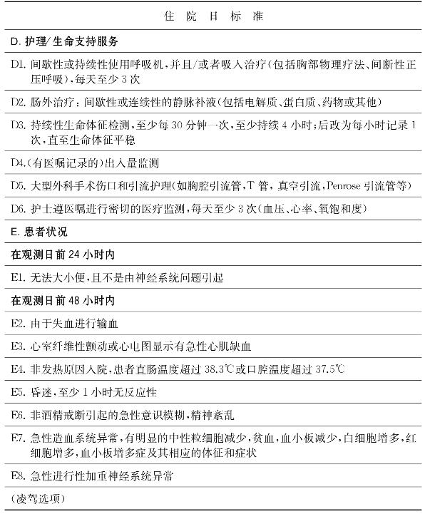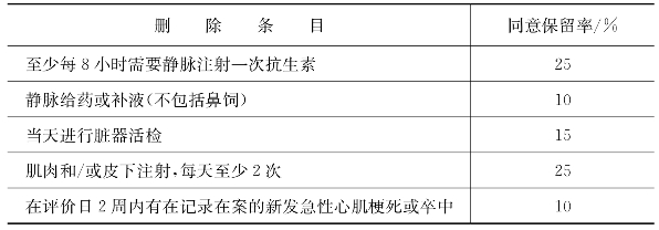 在第一轮专家咨询中,共有5个条目被超过四分之三的专家认为应该删除,没有专家提出更改和增加指标的意见。这五个条目分别是:“至少每8小时需要静脉注射一次抗生素”;“静脉给药或补液(不包括鼻饲)”;“当天进行脏器活检”;“肌肉和/或皮下注射,每天至少2次”;“在评价日2周内有在记录在案的新发急性心肌梗死或卒中(脑卒中)”(见表3-3)。专家认为不予保留的主要原因有“病情不严重”“可以在门诊完成”以及“单独适用性较差(可与其他条目一同使用)”。在第二轮专家咨询中,通过对第一轮专家意见的反馈,20名专家一致意见认为该5个条目不符合我国医学实践,可以不纳入C-AEP。