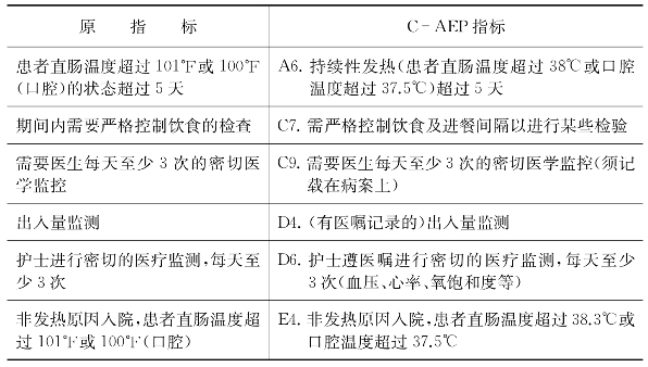 研究人员对随机抽取的10份病案进行评价后,对其中6个条目的可操作性和便利性提出了修改建议,与专家小组沟通后,研究小组对这6个条目进行了相应的修改。修改不涉及原指标实质内容和使用方式的变更,如原条目中涉及体温的标识单位均为华氏度(℉),而在C-AEP中,则使用更为通用的摄氏度(℃)来表示体温。变更条目如表3-4所示,最终C-AEP条目如表3-5所示。