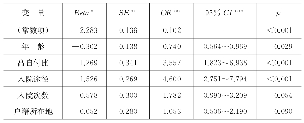 *Beta,回归系数;**SE,标准误差;***犗R,比值比;****CI,置信区间。